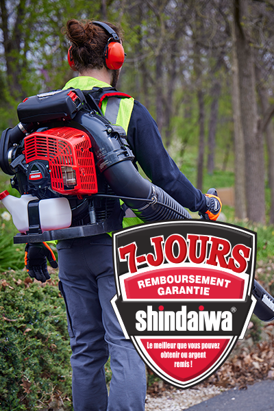 Chez Shindaiwa, nous appuyons la qualité et la performance durable de nos produits. Tellement confiants que vous serez satisfait de votre achat Shindaiwa, nous offrons une garantie de remboursement de 7 jours. Si, pour quelque raison que ce soit, vous n’êtes pas 100 % satisfait de votre outil ou équipement, vous pouvez simplement le retourner chez votre détaillant dans les sept jours pour un remboursement complet — sans poser de questions.