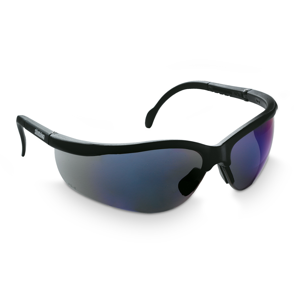 Shindaiwa's blue lens safety glasses offer stylish, functional eye protection against debris and harmful UV rays. Lightweight and frameless, they have rubber temples and nose pieces for comfort. The curved lenses provide excellent side protection against dust and debris, which is ideal for yard work or job tasks.